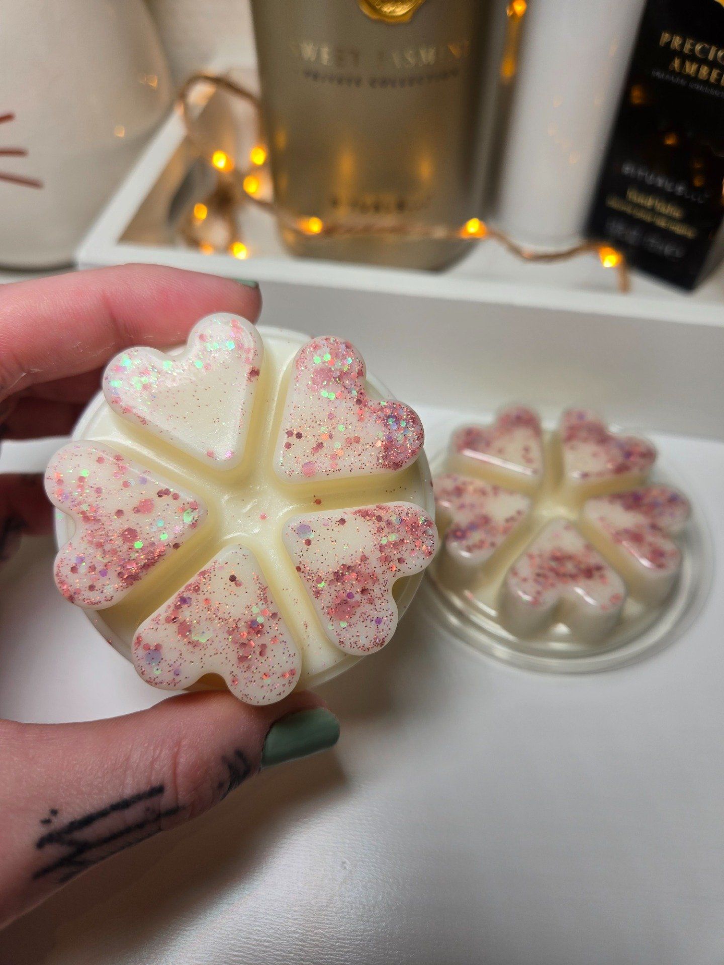 Ingrédients: cire de soja 100% végétale garantie sans OGM et sans pesticides, n’émet aucune substance toxique - parfums de Grasse qui respectent les normes européennes (CLP CE N°1907/2006 & 1223/2009/CEE) et françaises (IFRA) - Colorants - paillettes.