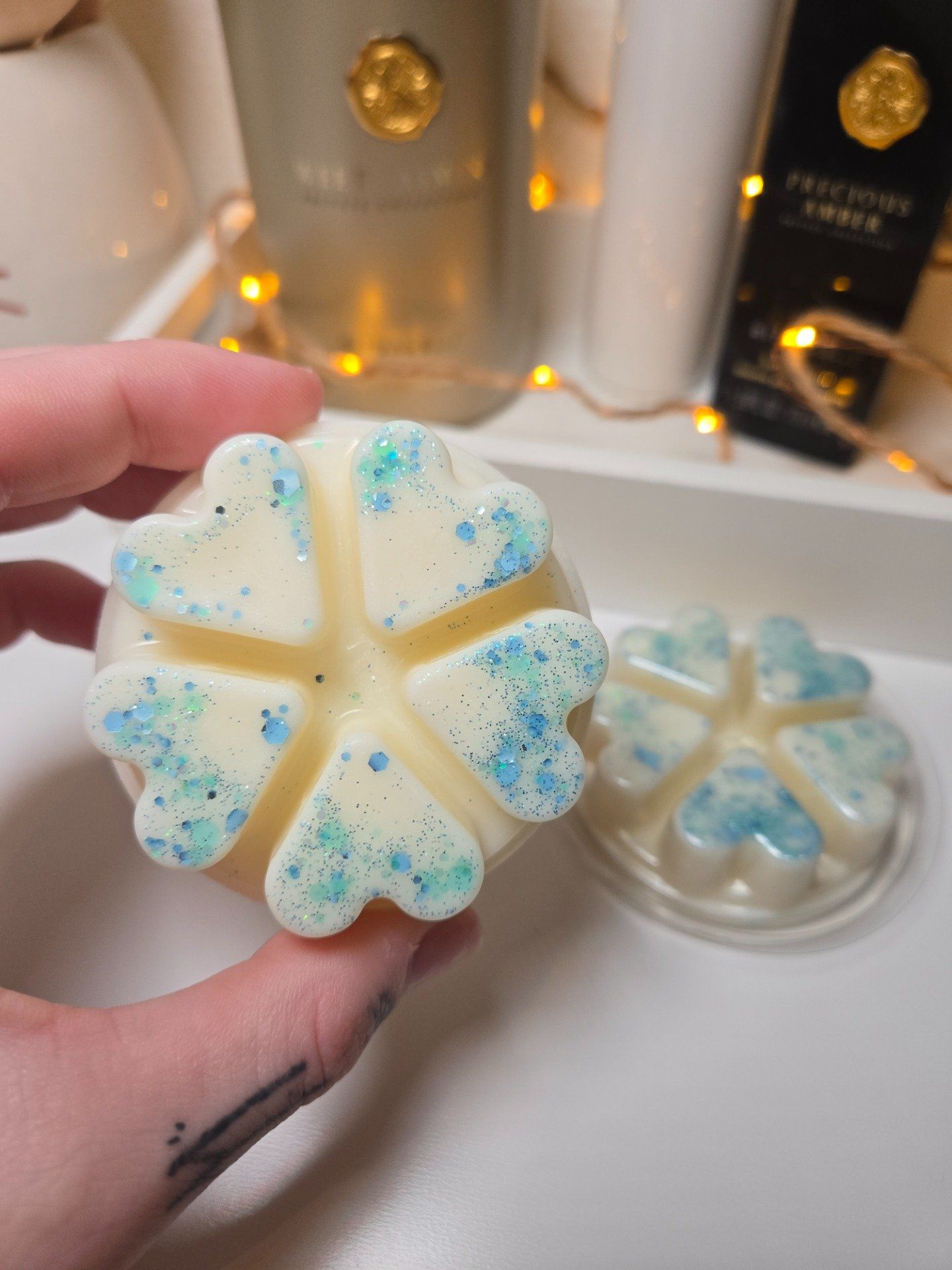 Ingrédients: cire de soja 100% végétale garantie sans OGM et sans pesticides, n’émet aucune substance toxique - parfums de Grasse qui respectent les normes européennes (CLP CE N°1907/2006 & 1223/2009/CEE) et françaises (IFRA) - mèches en bois de cerisier - paillettes.